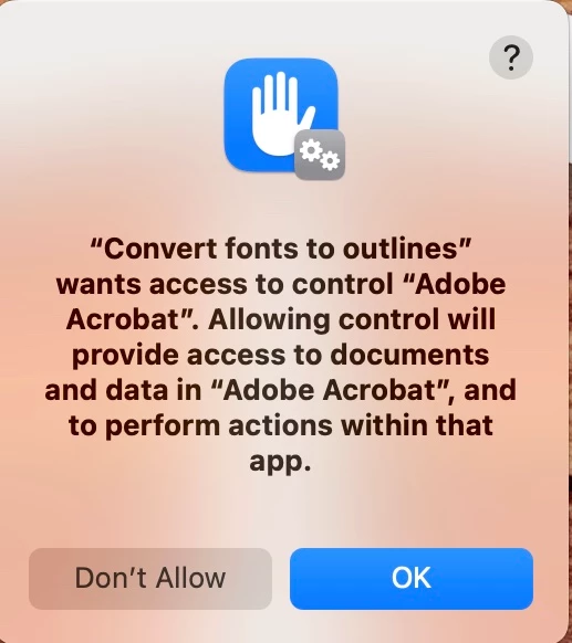 I've tried reinstalling Acrobat and give Acrobat full disk access (also creating the droplet again each time), but nothing seems to work. It's also worth mentioning that I have installed a custom Preflight profile provided by my company. This Prefilight profile worked fine up until now.