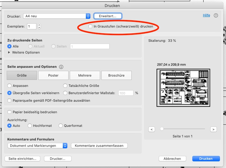 Hallo, leider kann ich die PDF-Dokumente nicht in Graustufen drucken. Über die erweiterte Druckereinstellung ist unter "Benutzerdefiniert" - "Ausgabe" - "Farbe" leider nicht die Option "Unsepariert - Graustufen" nicht wählbar. Ich kann lediglich "Unsepariert" auswählen. Somit ist in meinem Brother Druckmenü die Option "in Graustufen drucken" auch nicht wählbar.