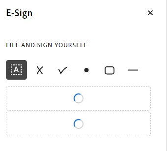 When I try to utilize the E-Sign features in Acrobat, the options show for about half a second then turn into blank boxes with spinning circles (pictured below). I have reinstalled Acrobat completely and it shows no updates available. Acrobat is through Creative Cloud, and is the full version. I've also tried disabling enhanced security options. Is there a setting that I am missing that might make this work? Any help would be much appreciated!