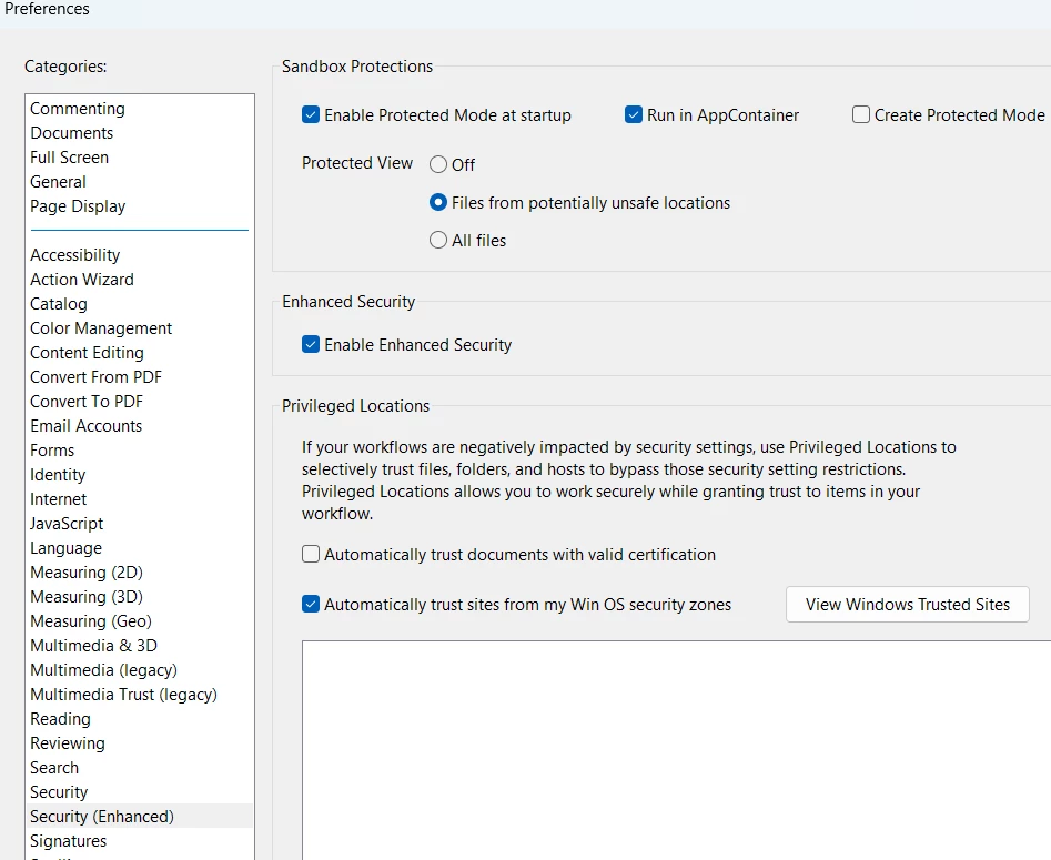 I'm using Acrobat Pro 2023 in conjunction with MS Edge to open pdf files on a webpage. The Edge browser locks up when I attempt to open the PDF and the PDF does not open. In Adobe Prefernces I tried turning off Potected View and that resolved the issue. I'm concerned that this method may pose a security risk. Is there somehting else I can try to resolve this?