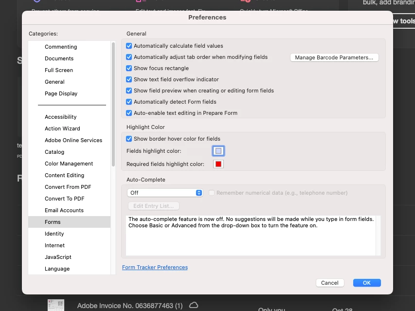 Every editable form part has a blue box. My issue is when I put text in the editable portion, it gets stuck behind the fillable form blue box and will not print or show up once it has text in it. For example, I put the text in and tab to the next part of the form and the text disappears behind the blue box, but when I go back in the box it shows up. What is strange is some part of the editable form works perfectly. You put information in the blue box, it stays in front of it and shows up when it is printed and saved.