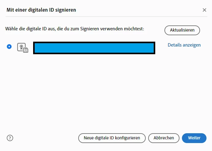 1. Ich habe nur 1 digitale ID konfiguriert und diese als Standard gesetzt. Kann ich die Anzeige der Dialogfelder zur Auswahl und Gestaltung der digitalen ID deaktivieren, d.h. die Standardwerte einfach ohne ständige Abfrage verwenden? (Nutzerunfreundlicherweise kann man nicht mal auf Enter drücken, man muss die Maus zum Klicken auf den Knopf benutzen)