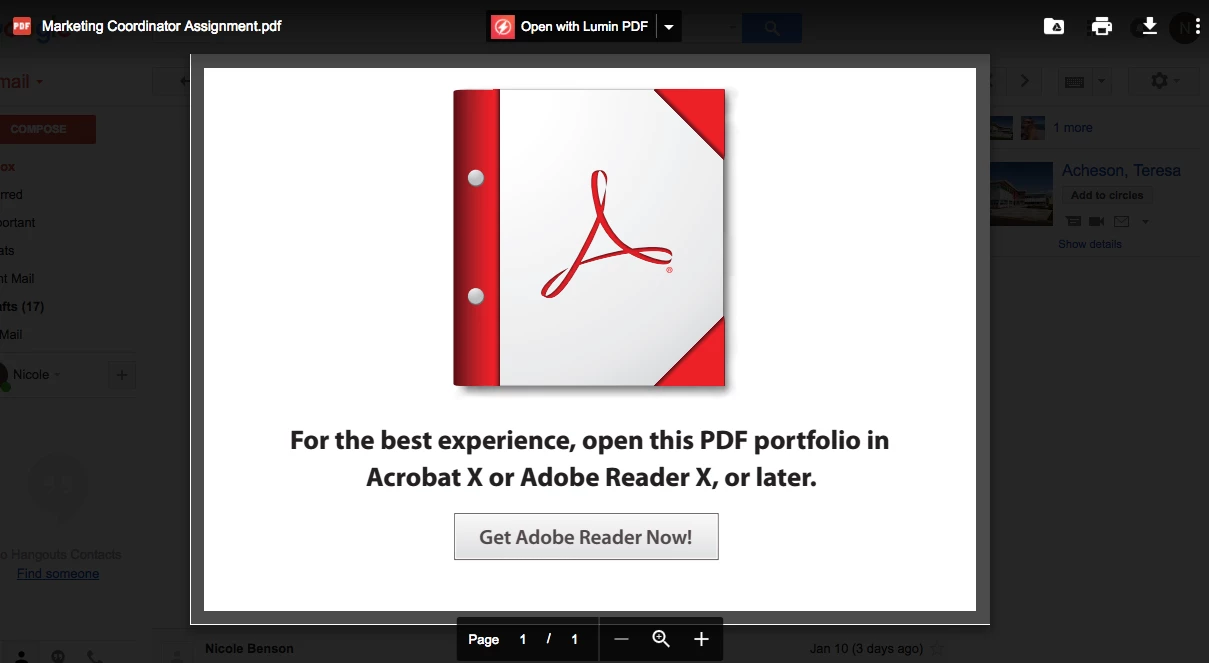 I was emailed a PDF attachment that is meant to have three documents/assignments, but when I click to open I get Error 404. I updated my Adobe reader to make sure it wasn't the program but no luck.