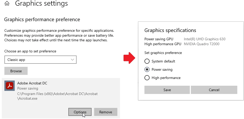 3. In the Settings window, click Adobe then Options, and select Power Saving.
