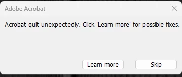 When enabling this feature (at least in Windows 11 22H2) and you close Acrobat a dialog box appears saying "Adobe quit unexepectedly.  Click 'Learn More" for possible fixes.