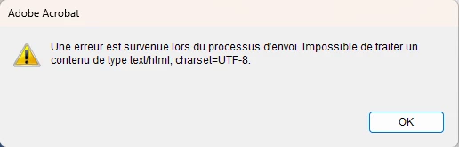 Adobe Acrobat. Une erreur est survenue lors du processus d’envoi. Impossible de traiter un contenu de type text/html; charset=UTF-8