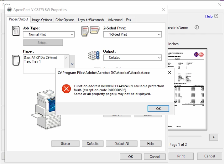 When i open the PDF, to print and properties then click ok, it will appear this error.