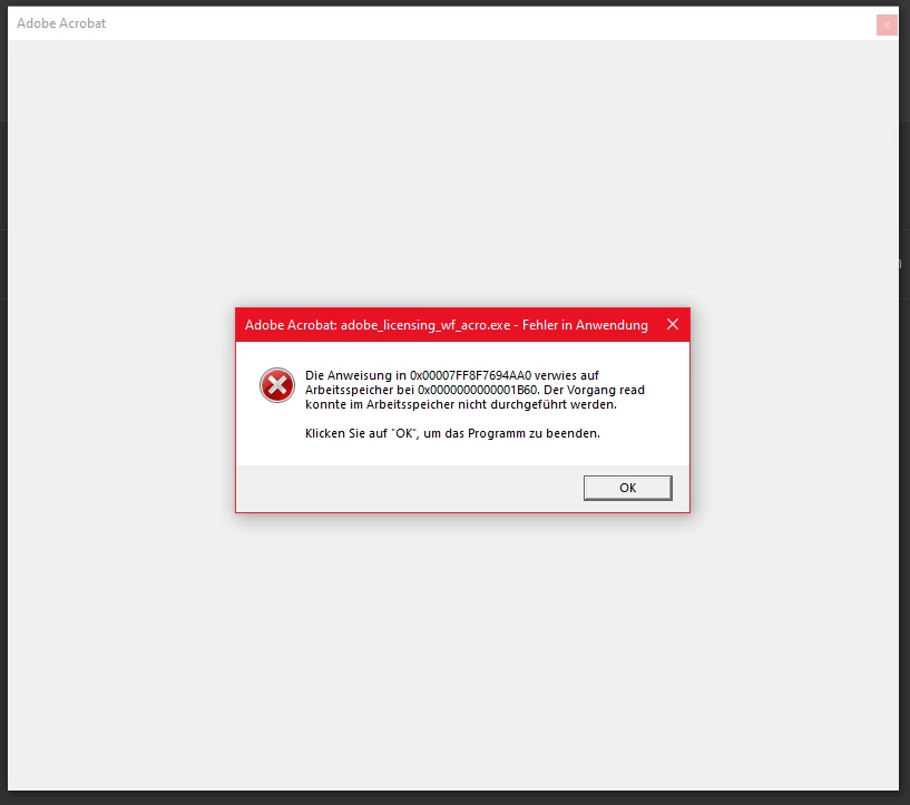 I already tried uninstalling, fresh installation via Creative Cloud or direct download, nothing works - now the interesting thing is, if I click OK on the error window, it closes Acrobat, but if I just put the window with the error to the side I can keep using Acrobat without any issues. Still sucks and would really like to use it again without having to do this workaround.
