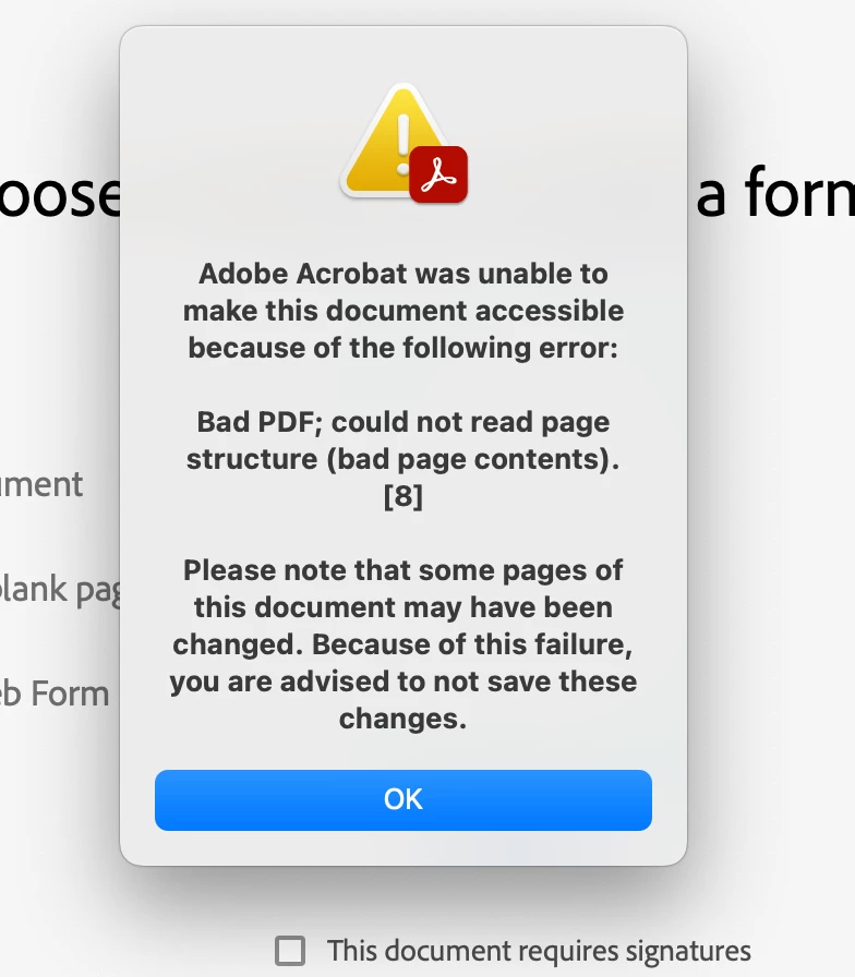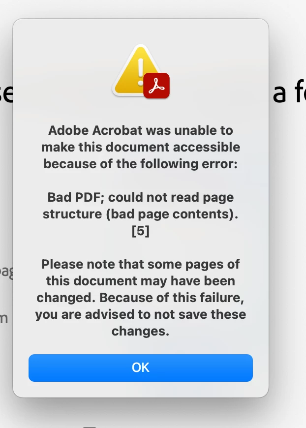 I am trying to use the Prepare a Form tool on Adobe Acrobat Pro and getting this error message repeatedly. I am struggling to work around it and would love any tips or suggestions.