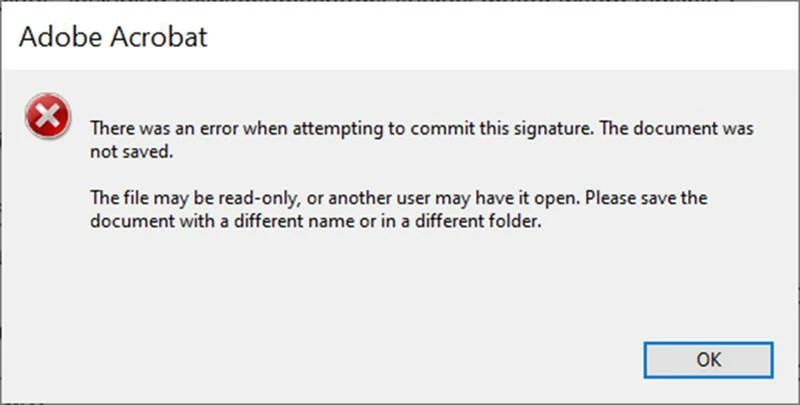 We have multiple customers complaining of the following error when trying to sign a PDF with PKI certificates from a smartcard. It occurs sporadically and the file is not in use by anyone else. Saving in a different location with a different name works sometimes but not always. "There was an error when attempting to commit this signature. The document was not saved. The file may be read-only, or another user may have it open. Plese save the document with a different name or in a different folder."