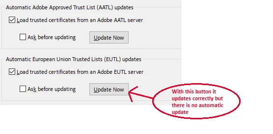 Adobe updates the list of EUTL certificates regularly, but Adobe Acrobat does not sync with that list automatically.