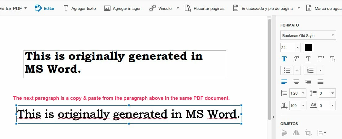 Other similar situation: When exported, the Bookman oldstyle for example is shown as the original, ok! so far... but when I try to copy it and paste somewhere else in the same PDF, the style and appearance of the font disappears. Even when the font selector in Acrobat shows me that the font is right there! How come Acrobat shows me something RENDERED on a different way! The attached pic illustrates the problem. Why is not posible to keep the same look of the exported document?
