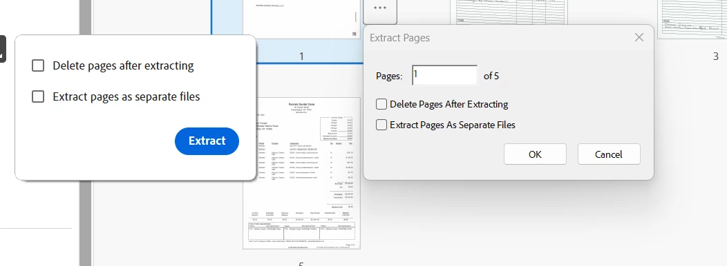 When I do an extract in Adobe Pro, I get two popup windows that open asking if I want to delete the document or keep it? Is there a way to stop one of the windows from opening. As soon as I click on the box to delete the document the second box disappears. Is there a preference I can set to always delete on an extract?