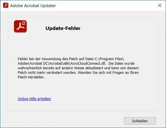 Please try to install the patch manually from the link: https://www.adobe.com/devnet-docs/acrobatetk/tools/ReleaseNotesDC/index.html and see if that works.