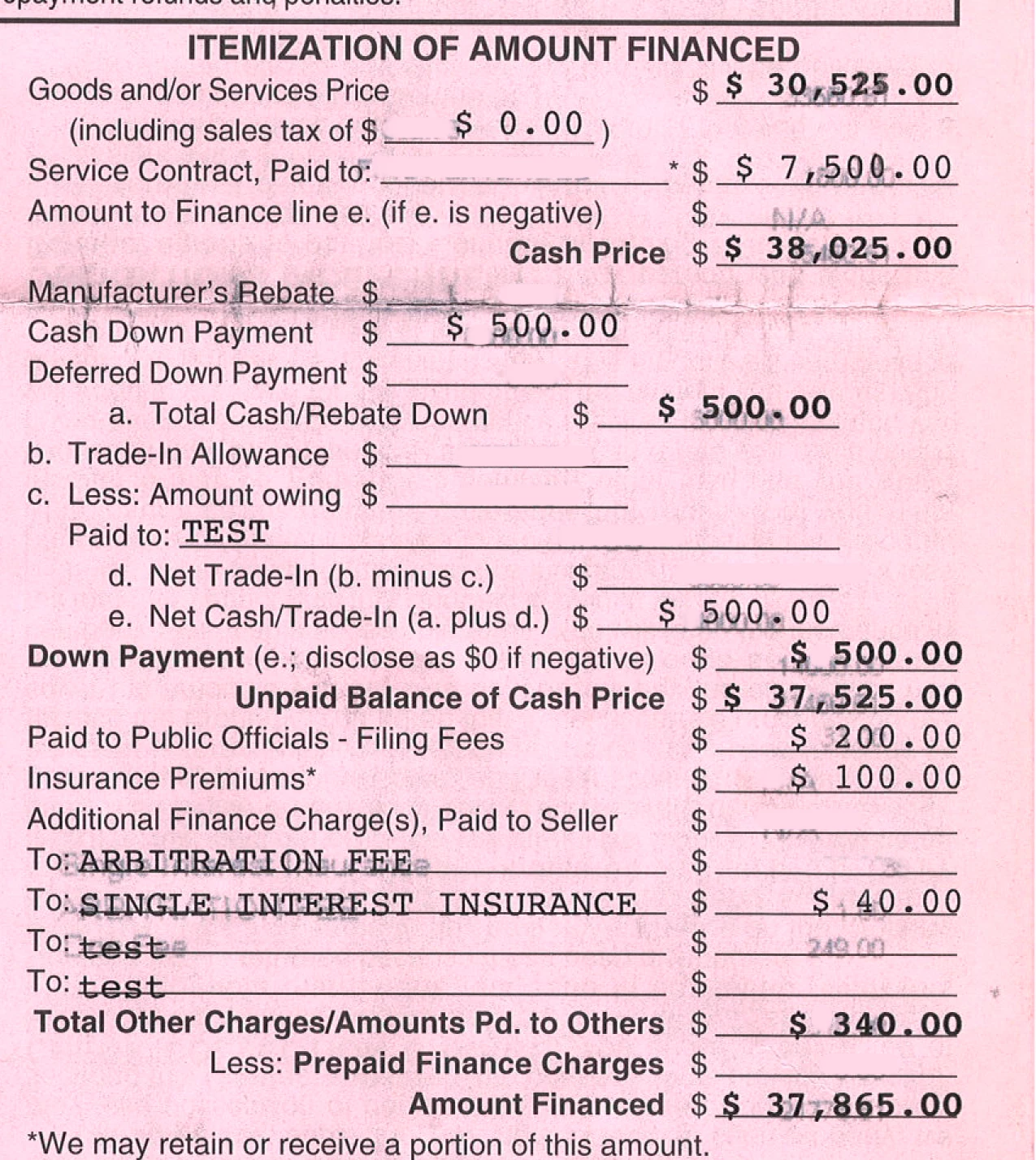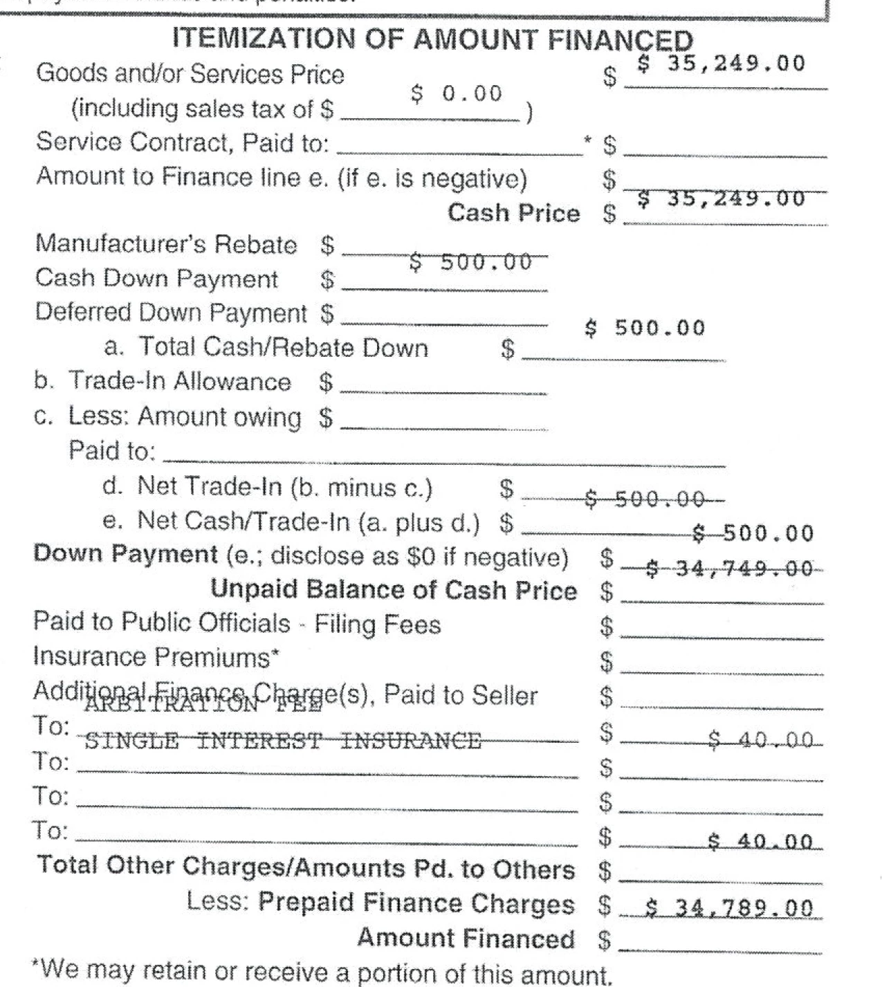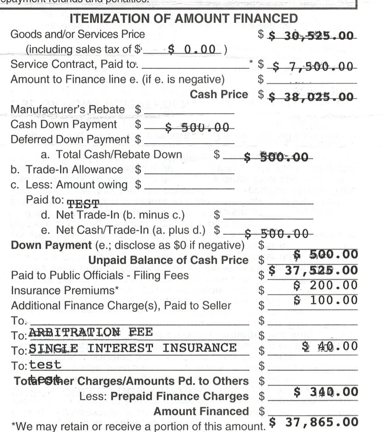 Today I received a call saying that for some reason, the contract is no longer printing correctly. A salesperson sent me a scan of the document, which showed the fields at the top of the page printing too low, the fields in the middle printing perfectly, and the fields at the bottom of the page printing too high. Below screenshot shows a portion of that scan. The last number ($34,789.00) should be on the line "Amount Financed".