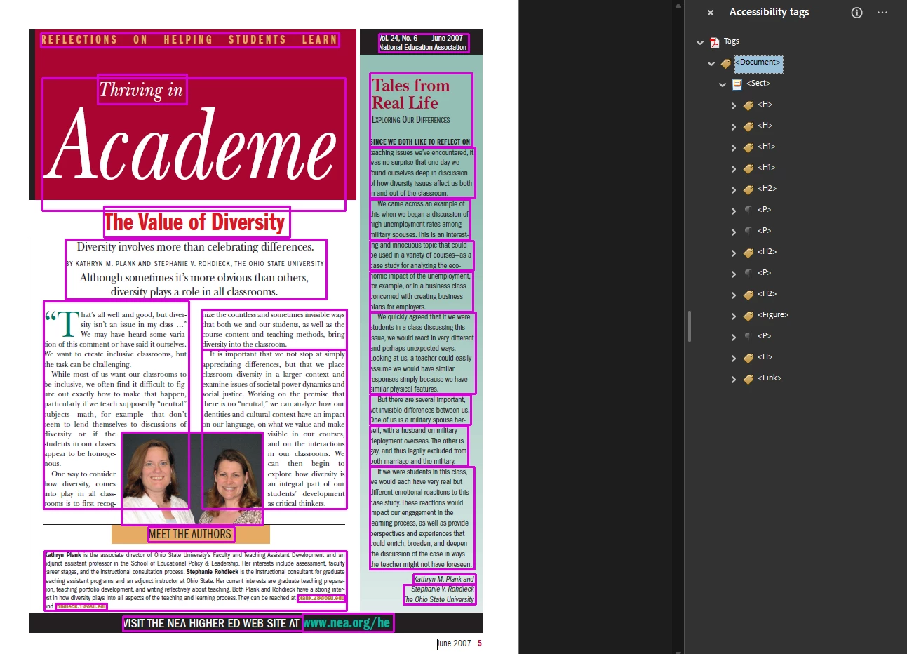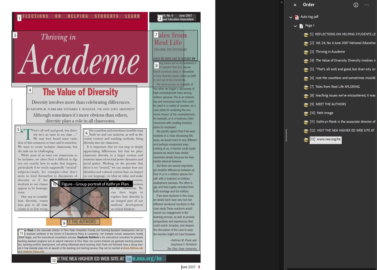 I am trying to ensure the screen reader accessibility of pdfs for an online class. I am having a hard time getting my screen reader (NVDA) to read the attached pdf in the correct order. I have made sure the accessibility tags match the reading order as shown in the screenshots. Currently my screenreader is not reading the way I have set it up. Specifically, the figure alt text is being read halfway throughout the main paragraph section. Instead of after the Meet the Authors heading. Could you give me any pointers on making this document screen reader accessible?