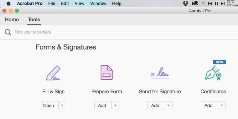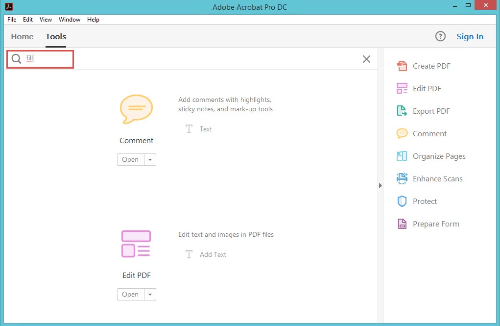 I am using adobe DC pro 2015.006.30280 , installed on windows 8 Pro. my problem is finding fill and sign feature it's not showing on my version I tried to use search tool but couldn't find it ,