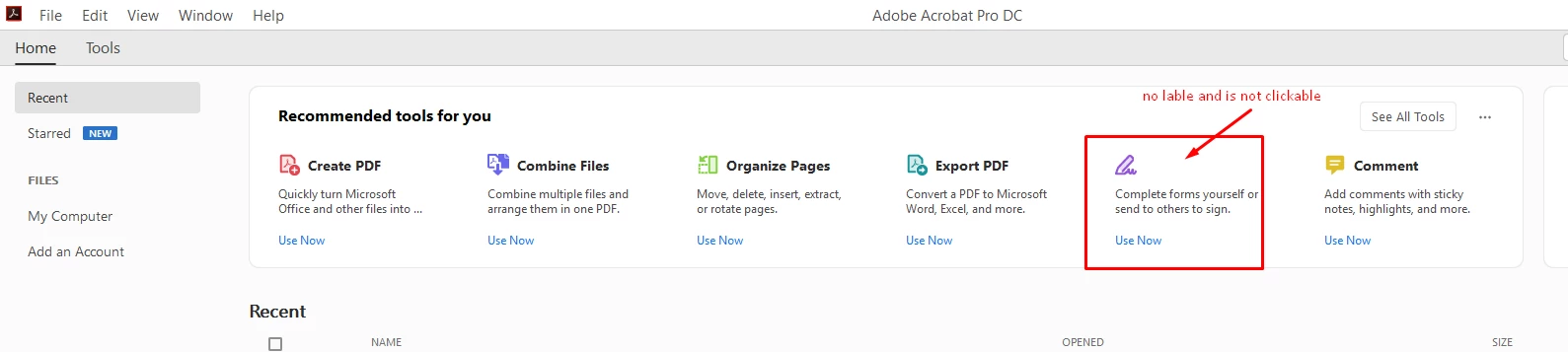 under recommendation tools the icon of fill & sign appears with our the label, like the other tools, and does not a response to any clicks... [print screen below]