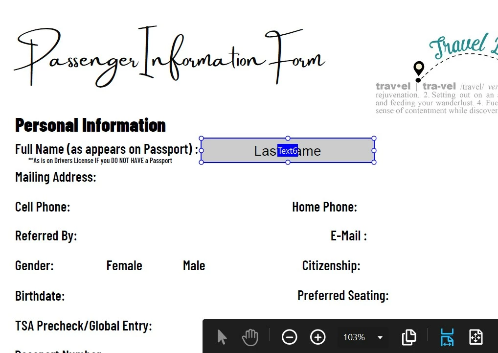 I am trying to create a fillable passenger information form for my aunt for her travel agency. I created the original form in Canva for font and images purposes. Here are the steps I followed:
