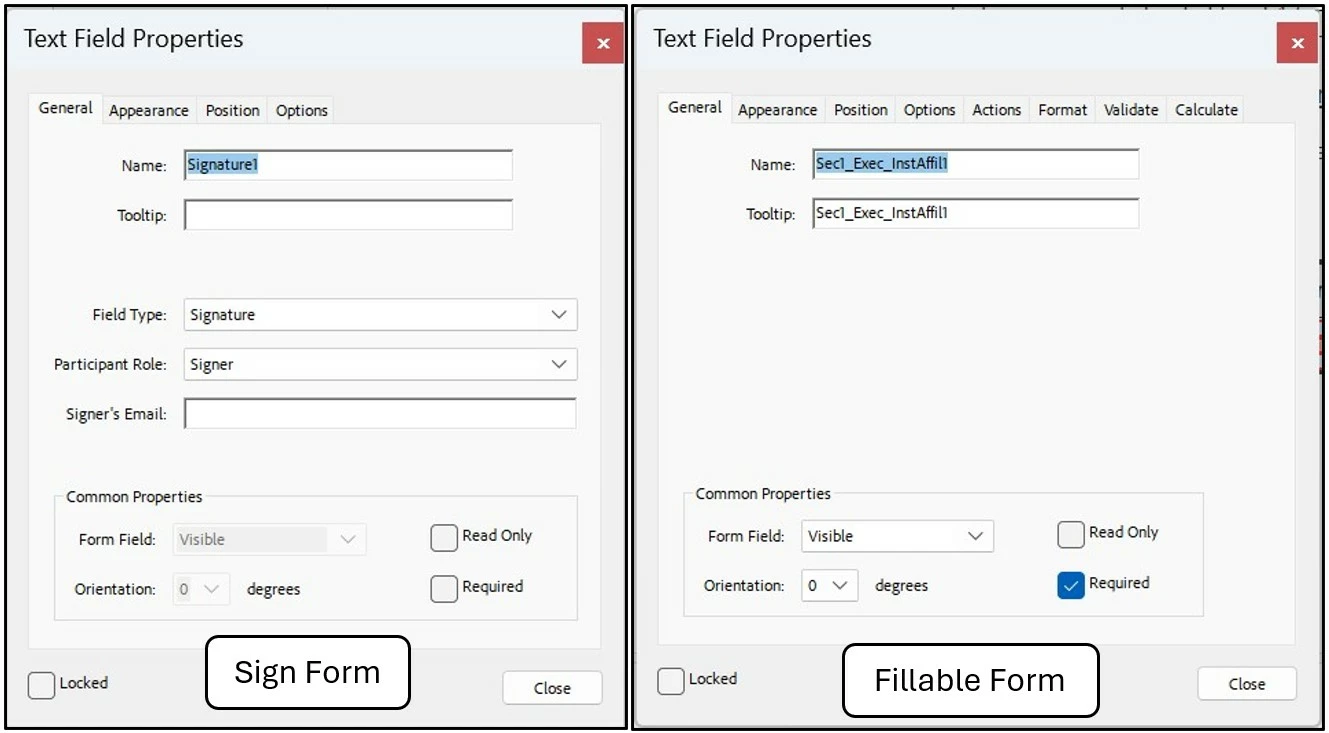 I thought I might have better luck converting the form with e-signing options (Prepare form for e-signing). But then I notice all of the field properties windows become boiled down to a minimal range of functionality---mostly text fields with a dropdown that allows you to select a more specific type of field, such as signature, which apppears no more special than a text field, anyhow. Gone is the "Button" field and other fillable form customizations, such as the ability to add Javascript functionality options to certain fields).