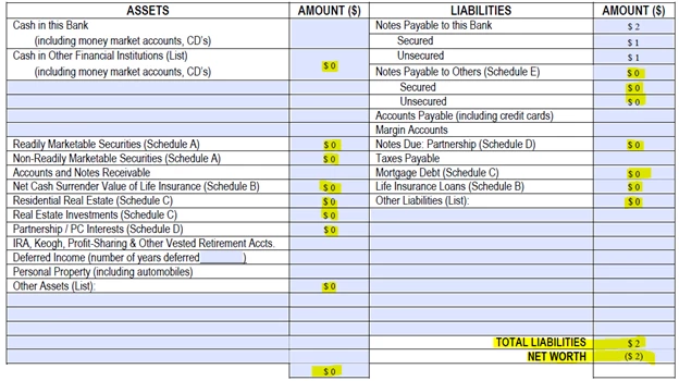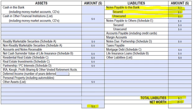I have text fields that despite showing $0 are throwing off my final calculation. For example, my notes payable to this bank text field is the sum of the value in the secured and unsecured text fields below it. If I put $1 in secured notes payable and $1 in unsecured notes payable the notes payable totals $2 and my total liabilities field, which is a sum of multiple fields, shows the correct value of $2, but the net worth showes -$1 when it should be -$2.