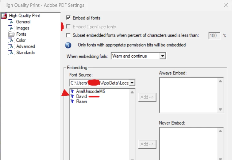 A specific font is generating gibberish. In the past, because I'm using language specific fonts (for Hindi, Arabic and Hebrew) I added the Windows User font folder to the distiller so that Adobe will look at both places (Windows/Fonts & "User"/AppData/Local/Microsoft/Fonts).