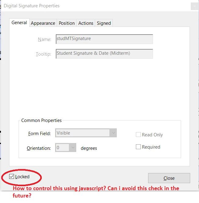 I asked the students to send me the pdf file, and when I checked I found that the digital signature form field is Locked. It doesn't allow me to make any change to the form field and somehow is also preventing the code to be executed. Please refer to the image.