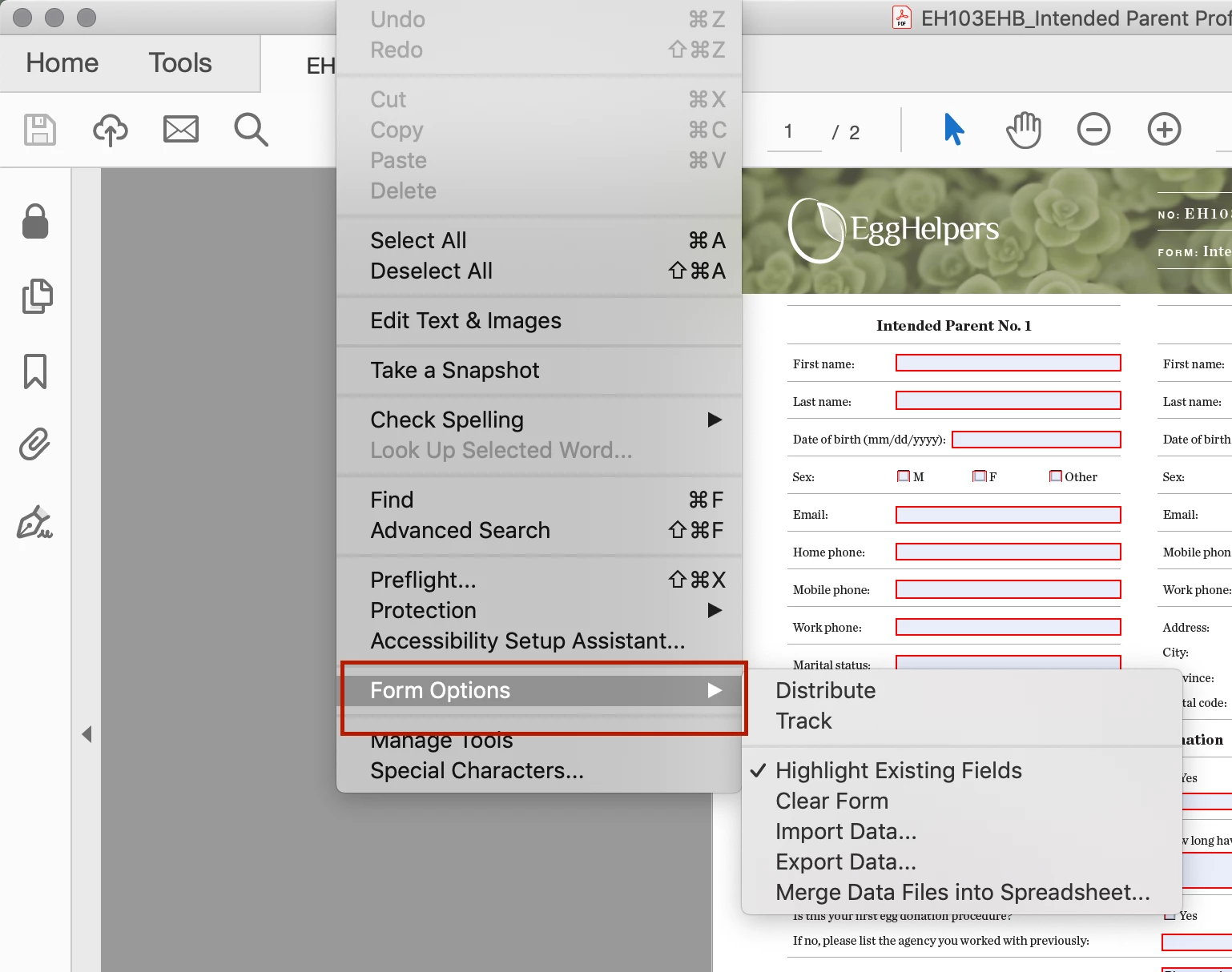 We often need to export the data in a PDF form, but the 'Form Options' under the Edit menu is sometimes missing. Is there something that causes this feature to not show up?