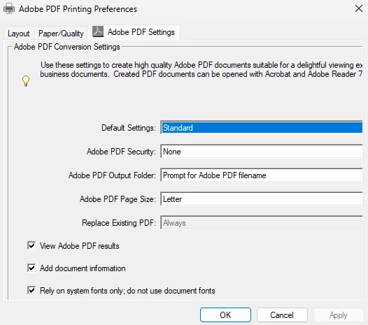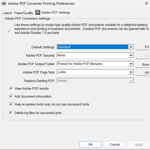 My actual issue is in the Printer Properties of Adobes PDF Converter the pop up screen in printer properties has the window cut off and users are only able to select the predifined sizes. They do not have access to the edit button to select a custom size. Picture of the issue attached.