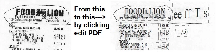 When you click on a PDF document that is just an image, Acrobat has to convert it to a searchable document via OCR. The poorer the quality of the original document, the poorer the quality of the OCR. For example, if you have "r" and "i" adjacent to each other, it can easily be confused to look like an "n" for the result. That's wrong, but that's what it sees. In addition, if you do not have the original font in your system, Acrobat will switch that font to something else. Ergo, the Food Lion font is completely different.
