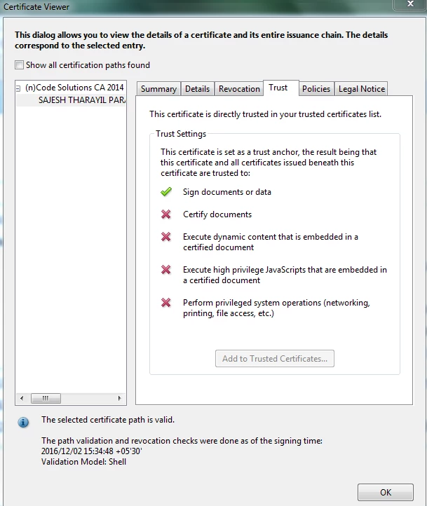 Click the "Add to Trusted Identities" button Set the desired "trust" settings