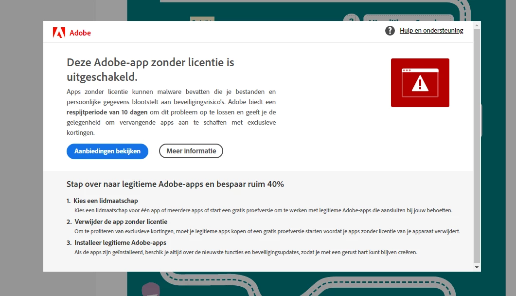 Since a while I constantly get the following message. It says that the Adobe App without license is deactivated. But I installed again and again. So I don't get it. I have logged in with my account, but still get this message. Frustrating. Does someone recognise this problem and knows what to do?