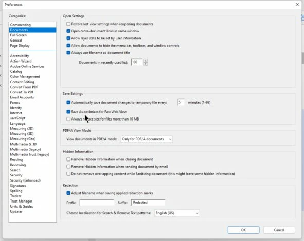When i want to save some of my PDFs ,Adobe Acrobat is crashing while its says:"Optimierung zur schnellen Webanzeige" how can i deactivate this unnessesary step, so I can save my pdfs without crashing.