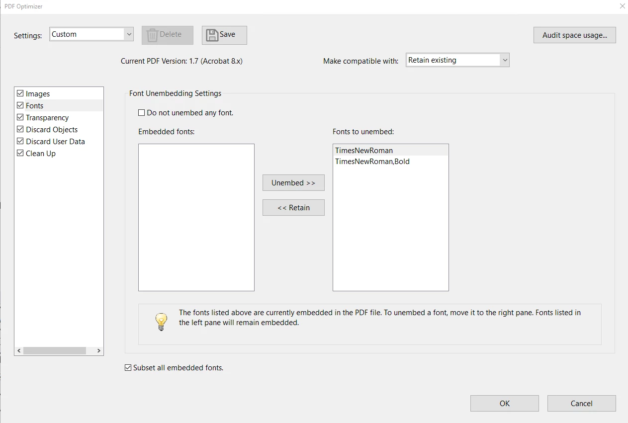 We are looking for a way in Adobe Acrobat Pro 2015 to optimize/compress the PDF while fully preserving form fields, layout, and visual quality.