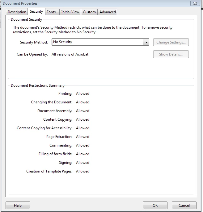 The Security tab of 'Document Properties' dialog box shows all as no security = allowed (see below)