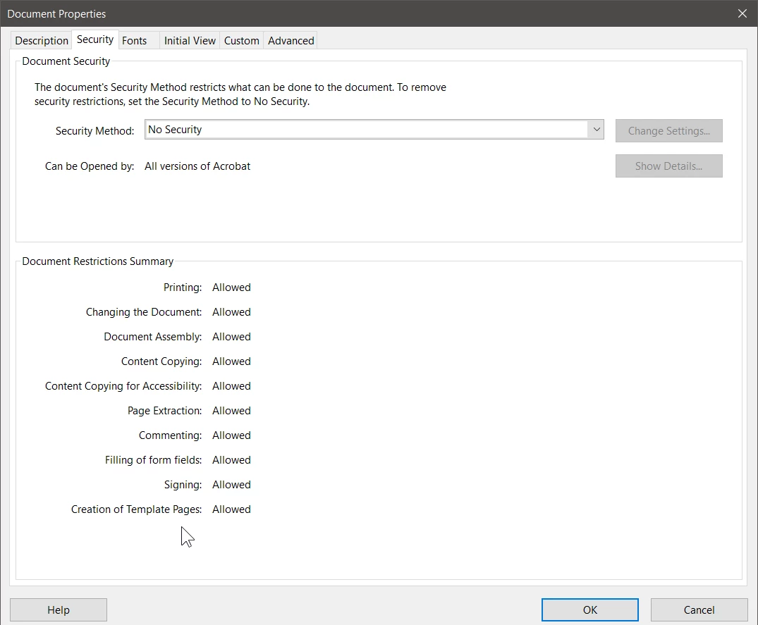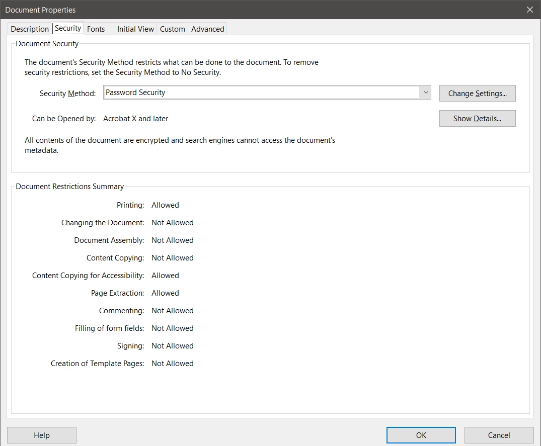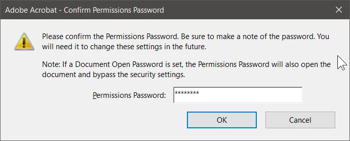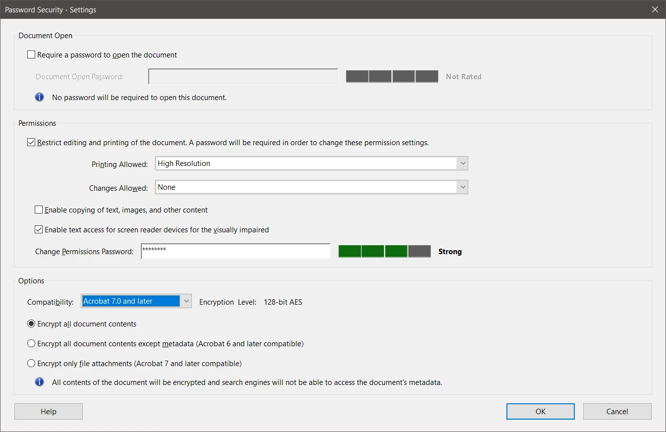 To set permissions, check the “Restrict editing and printing” option, select the restrictions you need, and provide a password as appropriate. Also choose the encryption options. This determines what versions of software can open the PDF file. Acrobat 7 compatibility gives you the most compatibility with PDF readers but the weakest encryption (128-bit). Acrobat X compatibility gives you the least compatibility (requires at least Adobe Reader/Acrobat 10) but the highest level of encryption (256-bit).