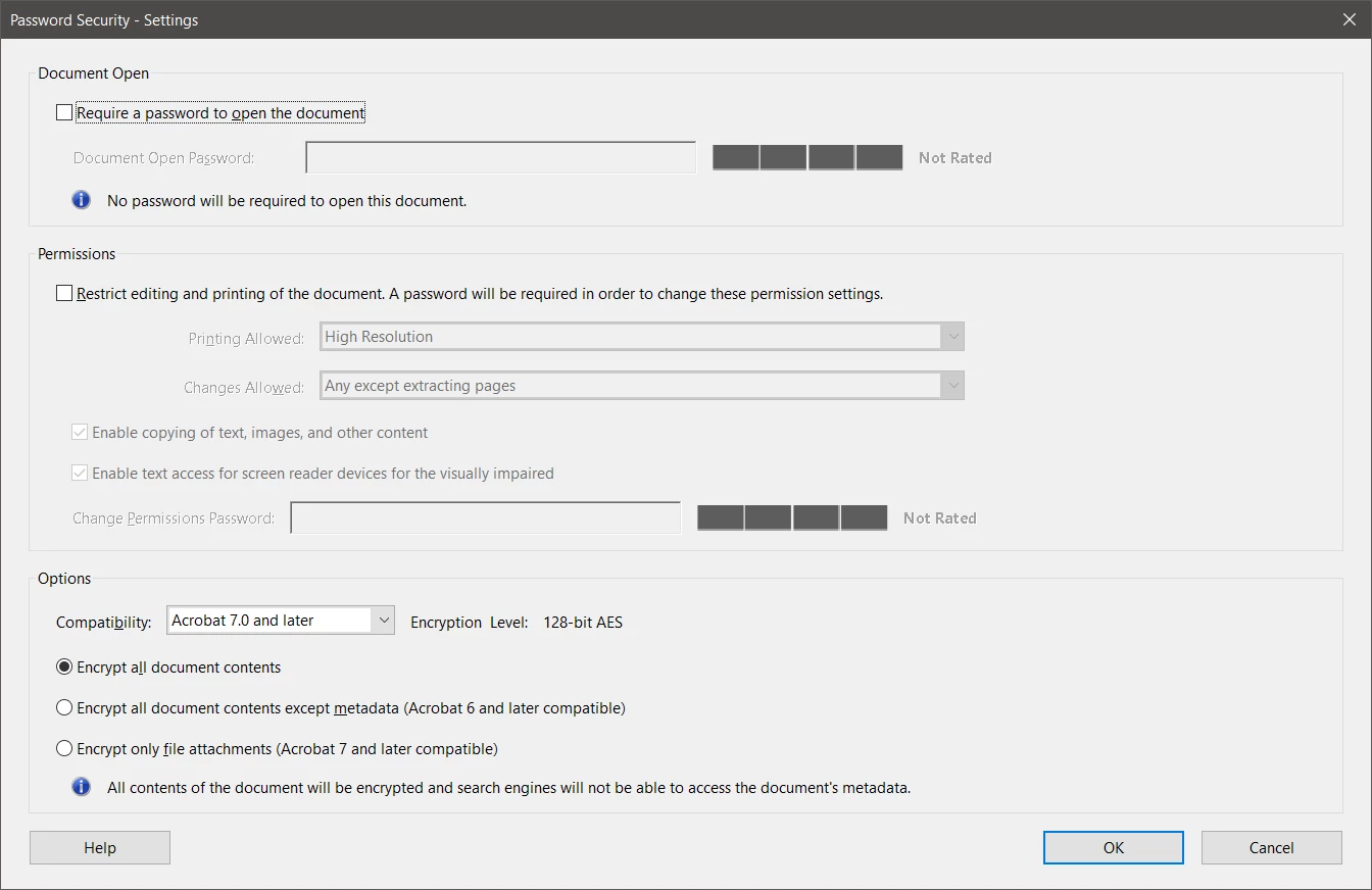 At this point you have a number of options. If you want to require a password to open up the document, you can specify that as the first option. This means that the only persons who can open the PDF file will be those who know the password for opening the file. This may be more protection than you need (at least based on what you initially posted), but the option is available. If you do this you select the option and specify the password you want to use. The “strength” of the password will appear graphically in the rating area on the right hand side.