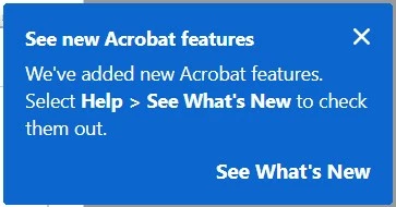 I pay for this (Acrobat Pro with Creative Cloud). I do not want pop ups interfering with my work flow. Put an option on the Help Menu for a path to details on new options & (internal Adobe advertising) . . .  I am working on a newsletter, I don't want pop ups for tax filing . . . really? Put that crap in the reader version if you must, after all it's free, but "WE" are trying to work here!