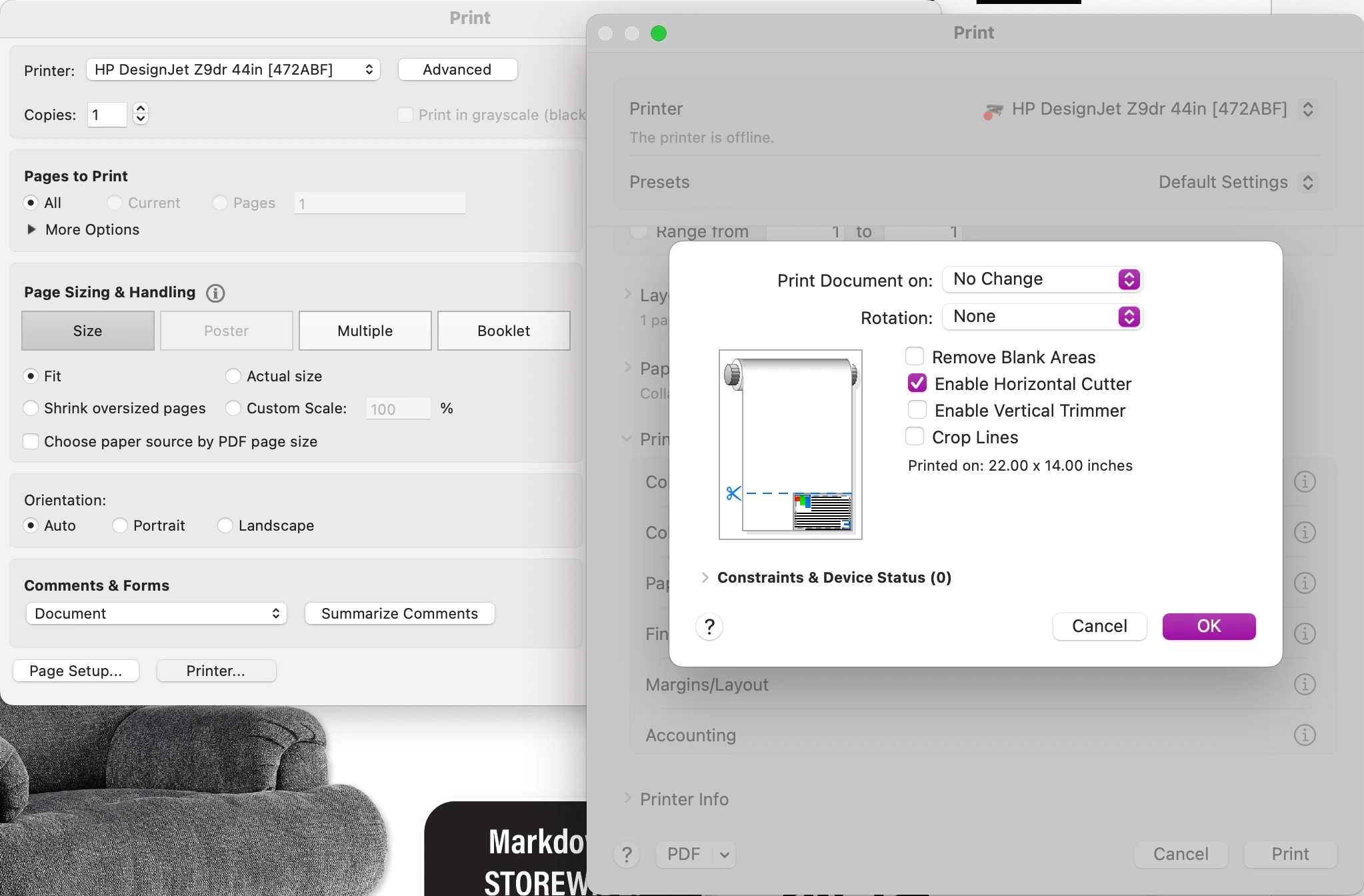 I recently bought a new Macbook Pro and I can no longer use the vertical trimmer option on my large plotter printer in the Acrobat print queue options. I took a screenshot of the old version where I had the option. How do I get the option to appear in the new Acrobat pro print queue?