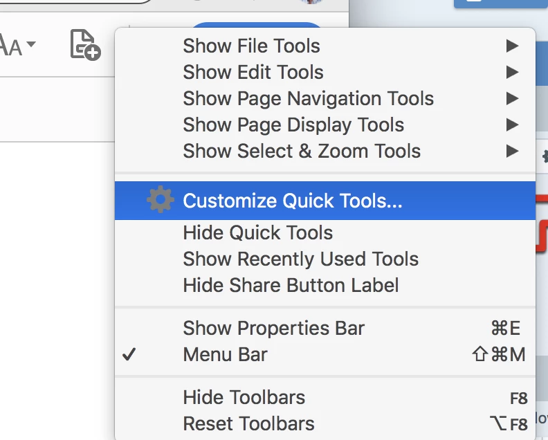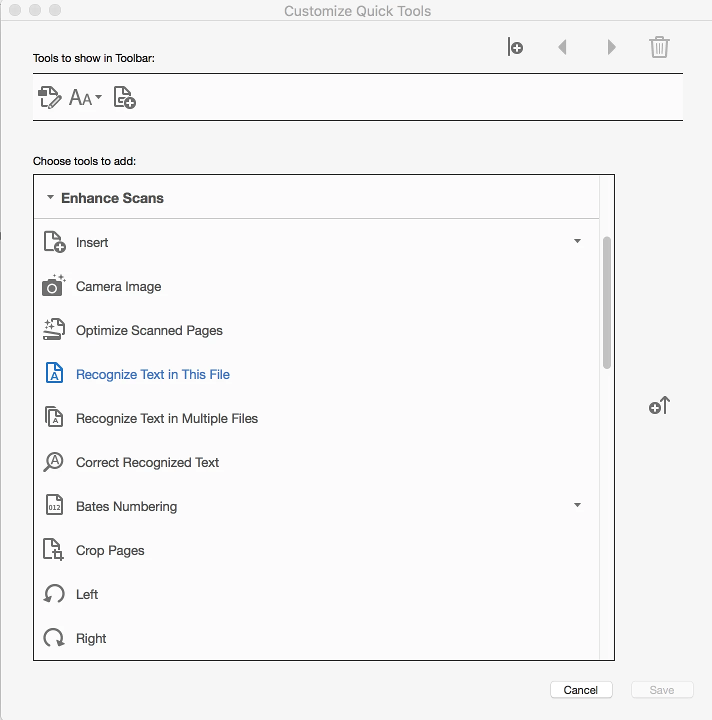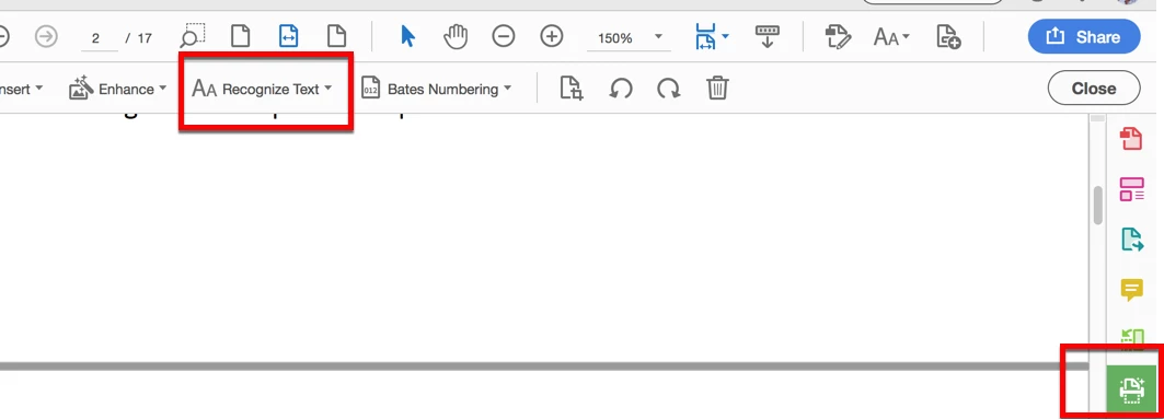 I am using Acrobat Pro DC on a Macbook. I receive batches of several PDFs at once via email and must always OCR one or two of them. Most of the time I can simply right click in the body of the document and select "Recognize Text". However, sometimes this command doesn't appear in the contextual menu. Since I am unable to locate any part of the interface that actually contains this command, my only choice is to use the "Search tools" function and partially type the name of the command. This is very inconvenient and I would like to either know some place the command can be accessed directly or some method of placing it in a "quick access" bar or some other interface element that would let me access this feature without having to search for it—preferably without having to navigate through multiple menu levels.