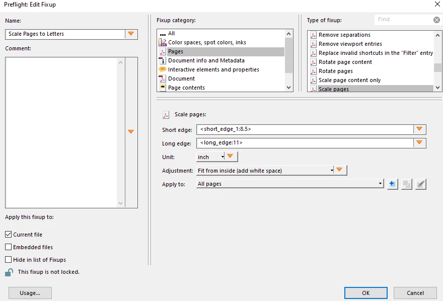 I am looking for assistance in how to scale down the page size of a pdf I have recieved from a client so that it may be uploaded to a online platform with both a page size and data limit. Normally I would be able to reduce the page size solely by printing to pdf but this is then dramatically increasing the file size from 5.69 MB to 52.5 MB which then makes it so the document is well over the document data limit for the platform. I have tried to optimize the document through adobe but it does not bring the file size under the date thresehold which is 10 MB. I have also tried to create a preflight profile to scale the document without printing to pdf but the program is consitently crashing when I attempt to apply the below preflight scaling fix. Not sure if there is a simple way to scale down the document to the necessary sizing within adobe and idealy to create a process which allows my office staff to either scale any documents they recieve automatically or by clicking a preset option. Also not sure if I set up the below preflight profile incorrectly resulting in the crashes I am experiencing.