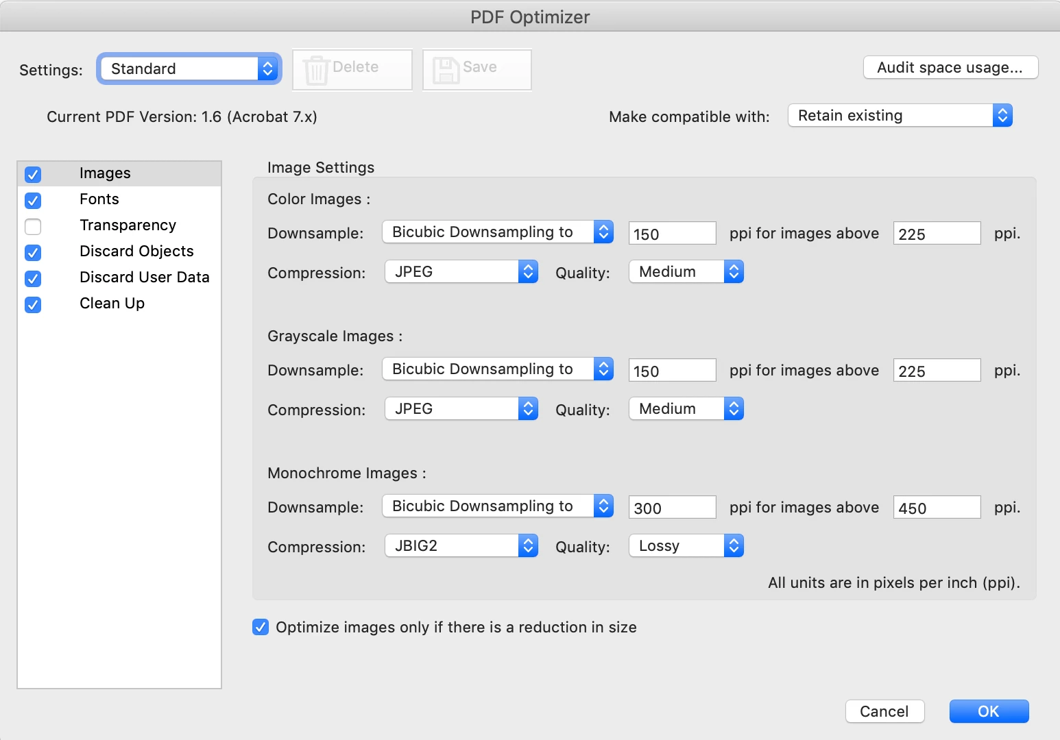 I think you are looking for File> Save as other> Optimized PDF. You can use this to downsample and/or re-compress images in a PDF, there are many optimize settings that help you reduce the size of a PDF, depending on the desired final use.