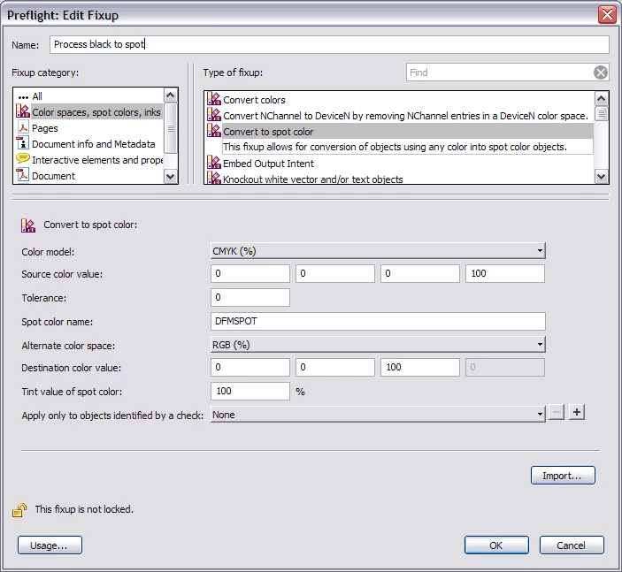 Click OK to save the fixup, then click FIX to apply it. To verify the result, use the Output Preview dialog in Acrobat.