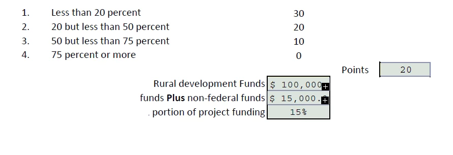* if  "funds plus non federal funds" are 20% but less than 50% of  "rural development funds" then the points will automatically populate as 30 points