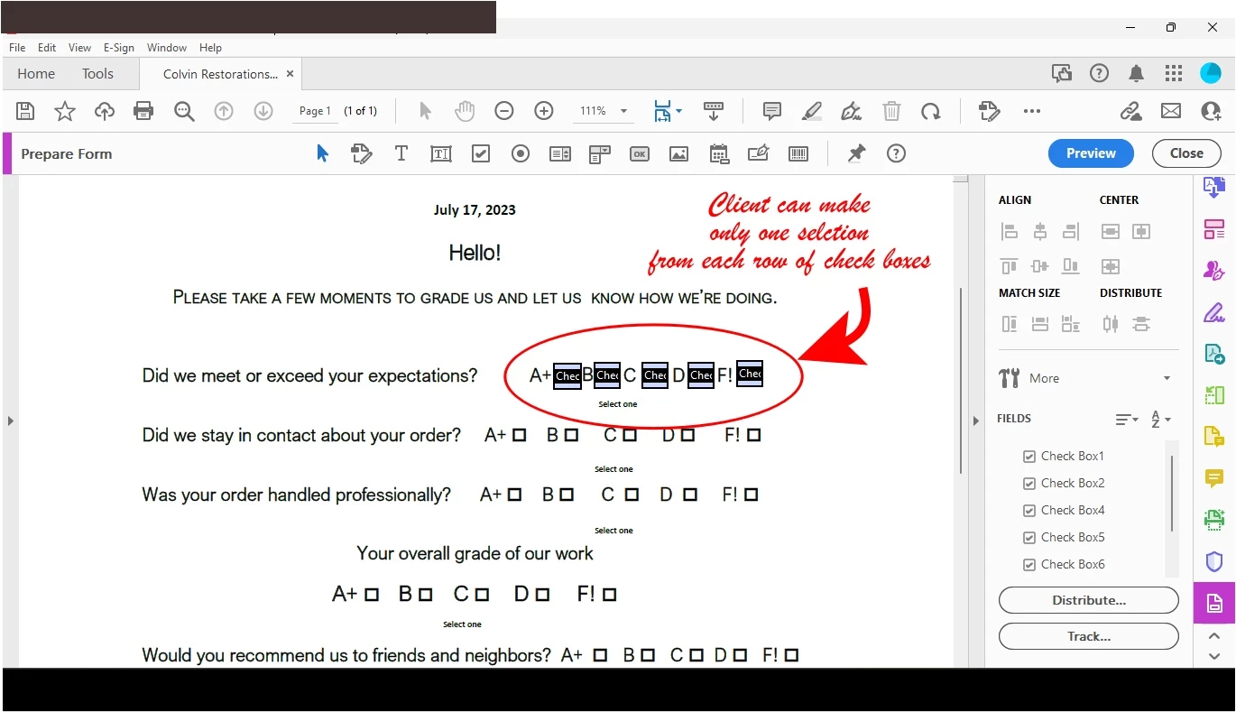 I'm trying to creating a web form for clients with a few feedback questions. Each question is allowed one selection in each row of 5 checkboxes. How do I create this? Or should I be using radio buttons or drop down menu?