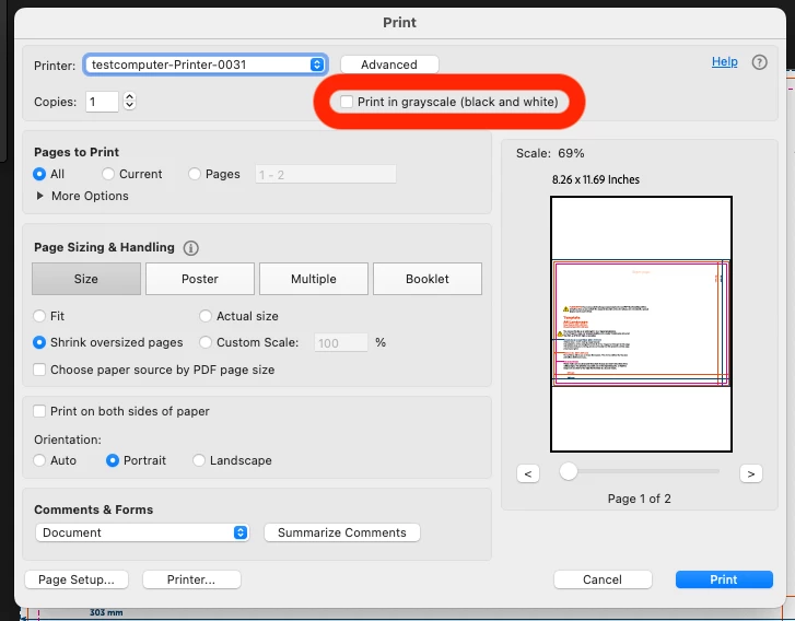 When users instead go through the “Printer…” button and select Color Mode: Grayscale from the system dialog, then my backend correctly receives ColorModel=Gray.