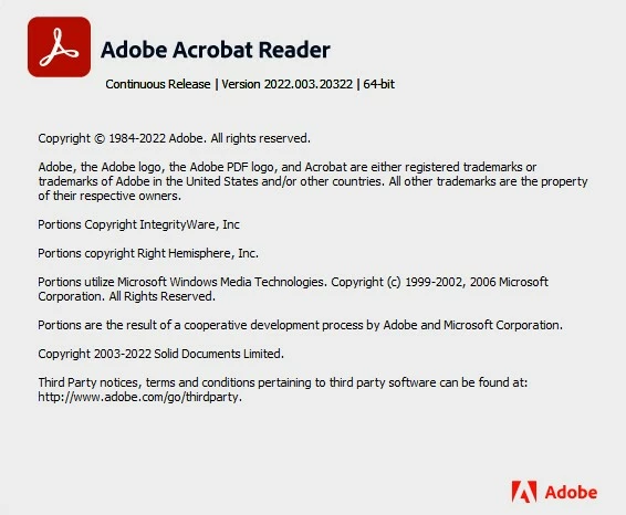 Acrobat Reader indicates I am using Version 2022.003.20322|64 bit.