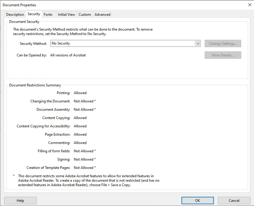 To create a copy of the document that is not restricted (no extended features in Adobe Reader), the instructions on the Document Properties Security tab says to choose File>Save a Copy, but that doesn't remove the restriction.