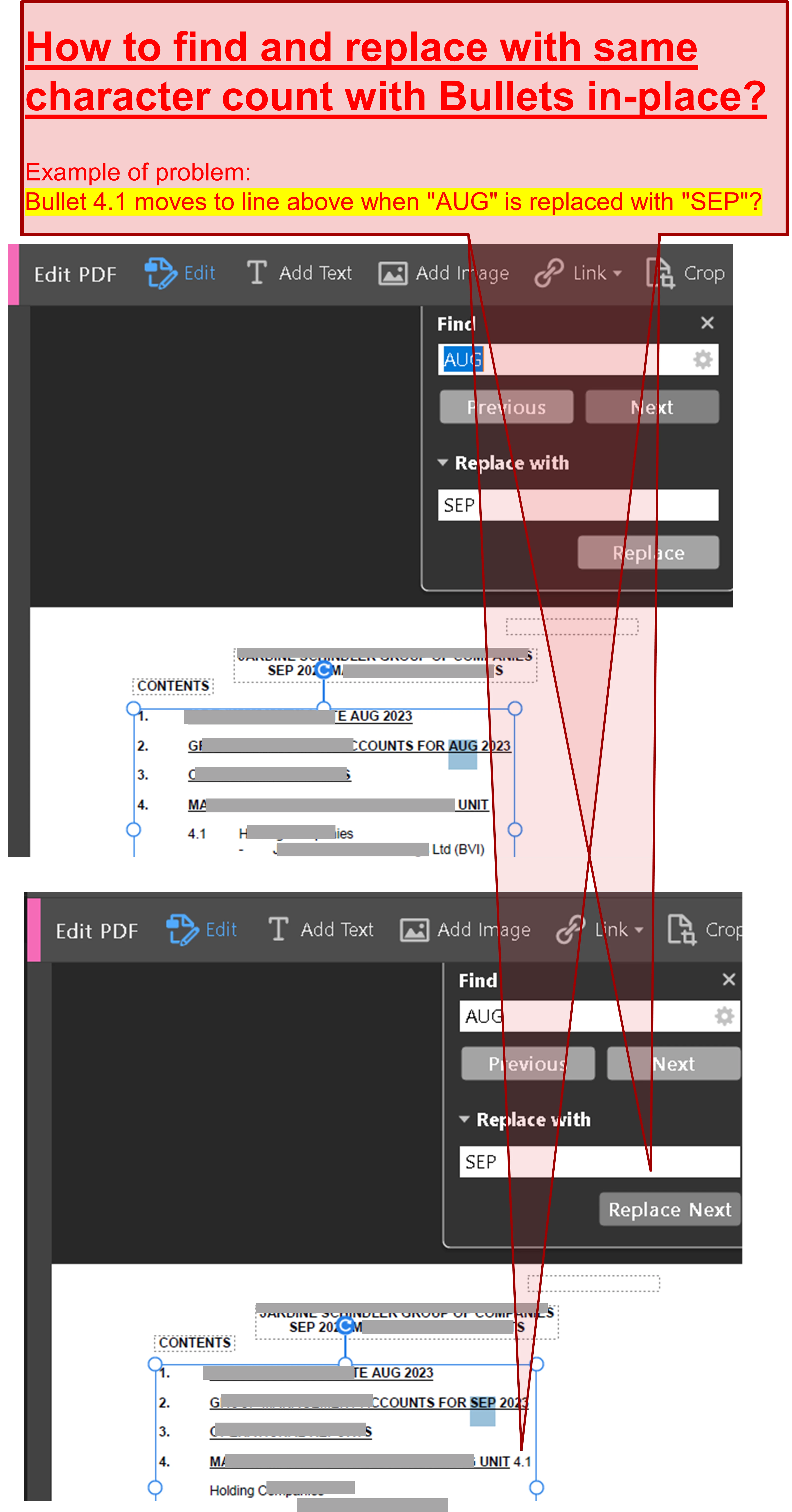 However, replacing "AUG:" with "SEP" in 2nd bullet affected sub-bullet (4.1) of 4th bullet; "4.1" now appears as suffix to line of 4th bullet; as if backspace typing was applied to bullet 4.1.
