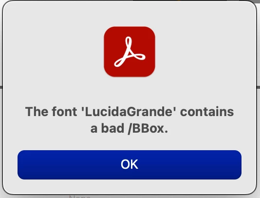 When I open a pdf file which is created in Adobe Acrobat DC i am getting "The font 'XIWFFX+Helvetica-Bold' contains a bad /Bbox." as warning message.
